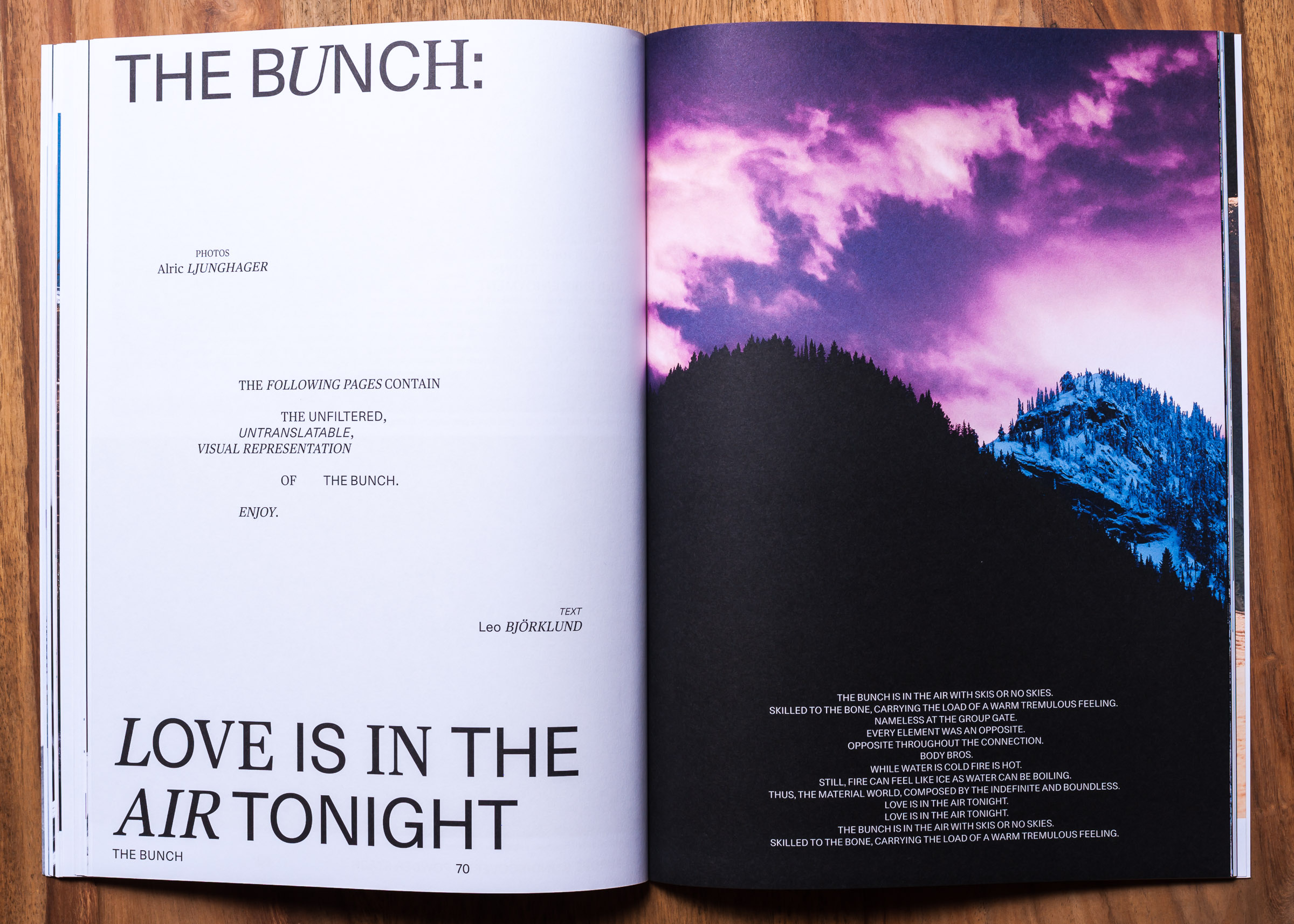Our final feature in the Winter 2018 issue takes an unconventional look at the influential Swedish crew The Bunch. With evocative photos by Alric Ljunghager and words by Leo Björklund, these pages will transport you into the esoteric Scandinavian state of mind behind the trend-making styles of this special group of skiers.
