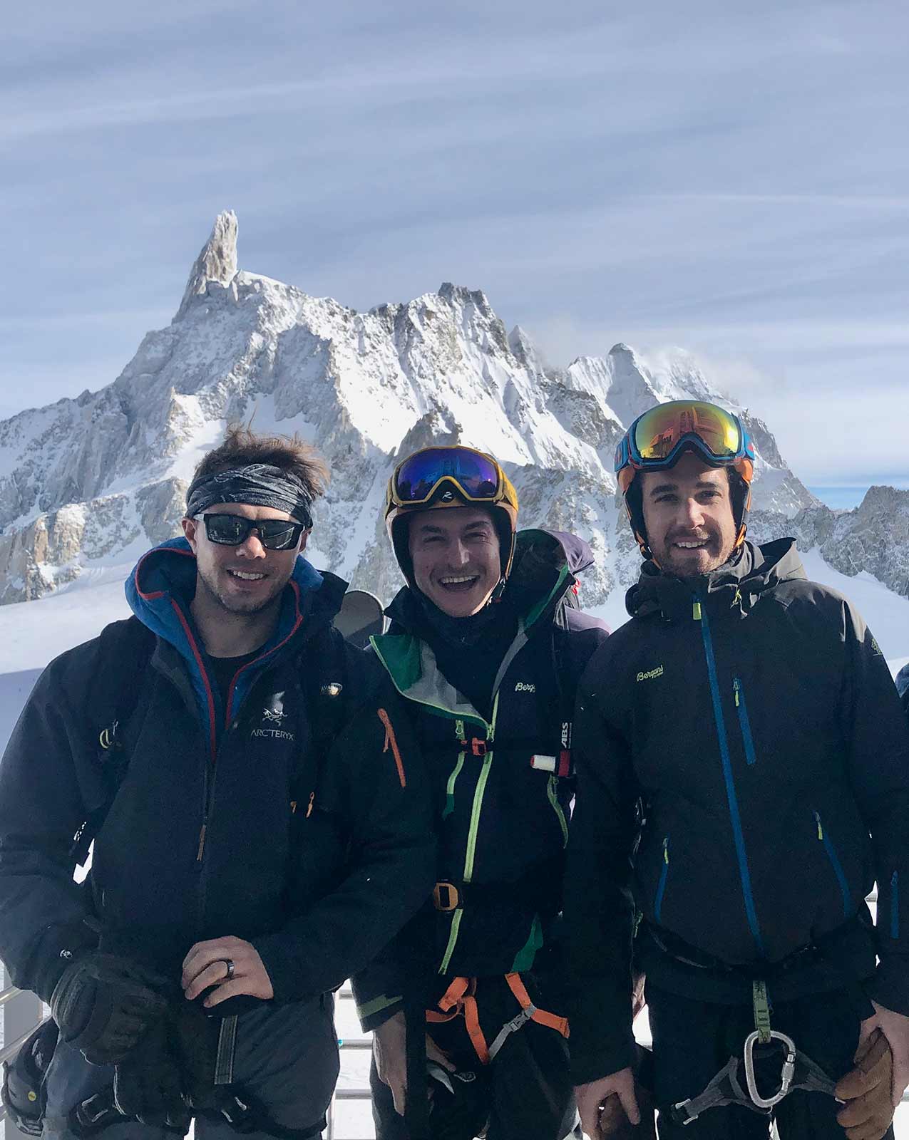4FRNT´s new owners Charlie, Ebi and Will getting ready to ski the Vallée Noir in Courmayeur, Italy.