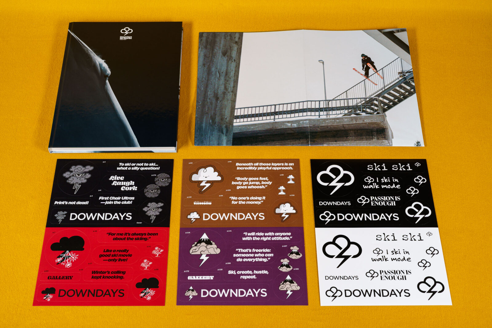 We already mentioned the stickers. Harking back to the good ol’ tradition of sticker sheets in ski magazines—and sneaking in some marketing with a sheet of classic Downdays logo stickers—we try to give you an interactive experience with Ski Stories, Volume 6, bridging the gap between analog and digital media. Two sticker sheets are filled with icons and pull quotes from the stories. There are indications throughout the book, where we had envisioned those elements during layout—but of course feel free to apply these stickers wherever you see fit.