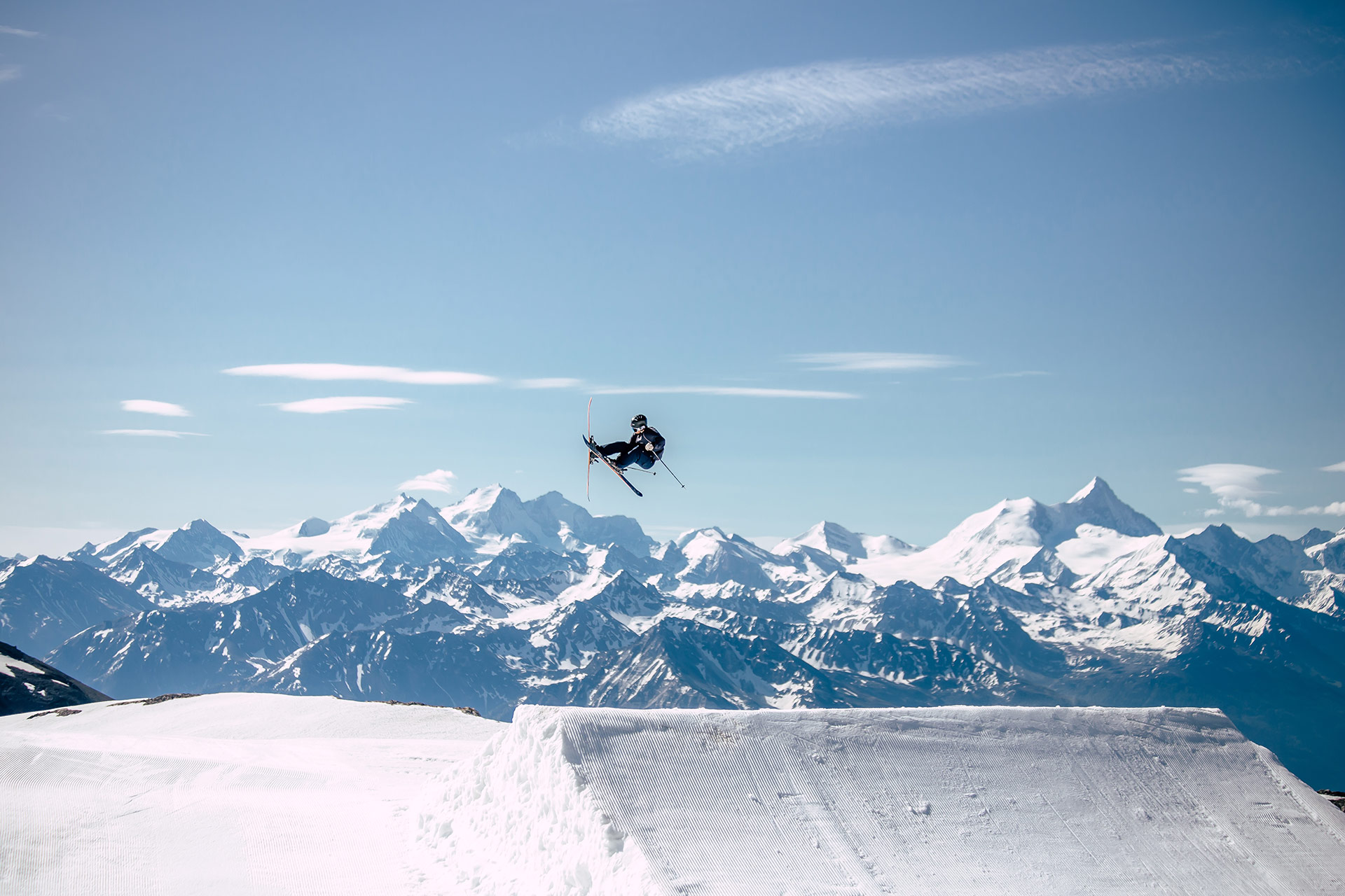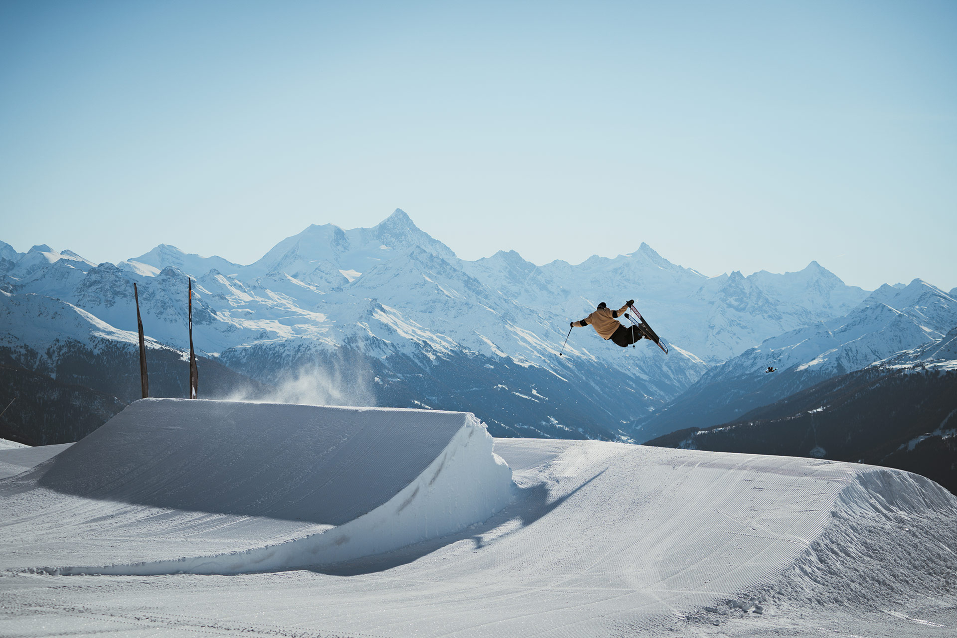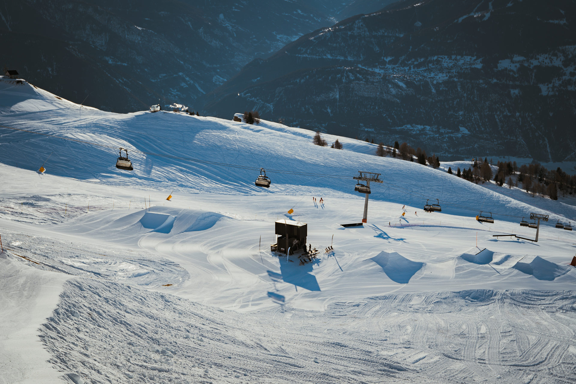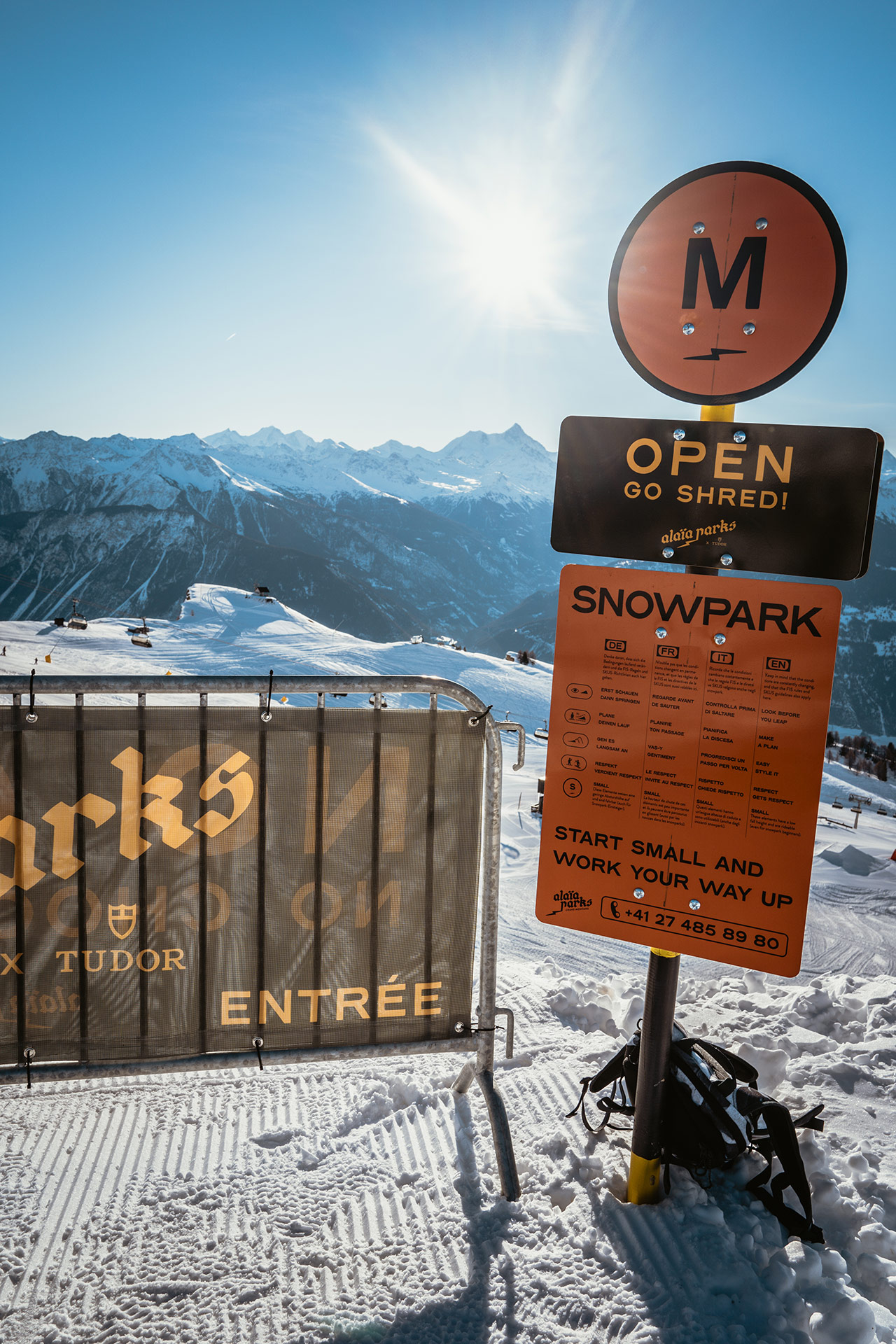 With its Olympic-size halfpipe and 140,000 square meters of terrain, the Crans-Montana snowpark was already one of Europe’s best. The new “Alaïa Parks by Tudor” promises to continue the rich tradition of freestyle in western Switzerland. Beginning in December, various lines have opened progressively, starting with the Cry d’Er zone and continuing with the “Mérignou” mini-park. Towards the end of the season, the snowpark will migrate up the mountain to the Plaine Morte Glacier, where the park will continue operation into June. On-snow operations have been entrusted to Helvepark, a Swiss company specializing in snowpark operations. You might already know them from parks like Gran Masta Park in Adelboden-Lenk or the Prinoth X Camp on the Stelvio Pass in Italy.