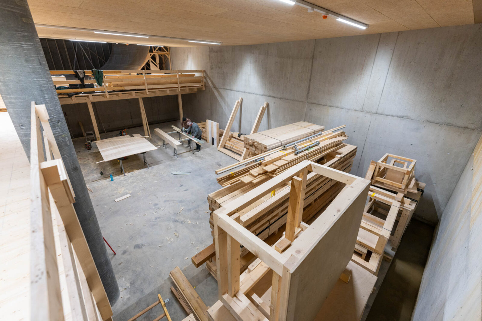 The underground location of the new hall presented unique challenges. This complicated the delivery of construction materials, many of which were reused from the old hall. True to the motto of “reduce, reuse, recycle,” as much material as possible was reused. For large pieces that couldn’t be disassembled, some creative maneuvering was required to get them into the hall. Around 200 cubic meters of new wood was also used in the construction.