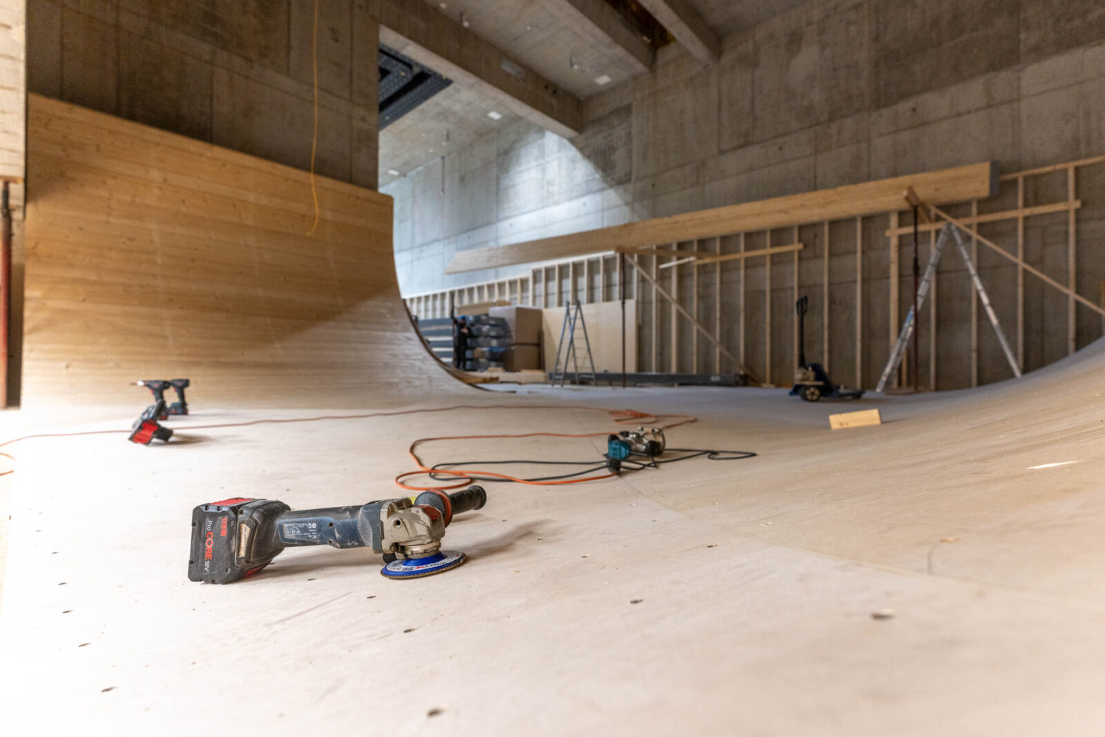 At 2,000 square meters, the new space is much bigger than the previous 1,300-square-meter facility. The new hall is intended to reflect the changes in freestyle sports in the past years. Planners drew inspiration from freestyle coaches, national and international athletes and current trends in the scene. Only the three main sports have stayed constant: skating, trampoline and parkour.