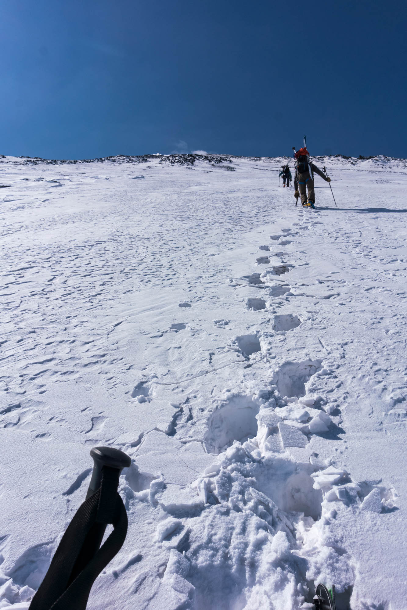 Local reindeer hunters, acquaintances of Ivan, towed us to a volcanologist’s research hut at the base of Klyuchevskaya. Heavy weight, variable snow, difficult terrain and route finding slowed the tow-in to a crawl. During our approach, we watched the wind rip clean white snow from the mountain’s upper third, leaving an icy sheen in its wake.