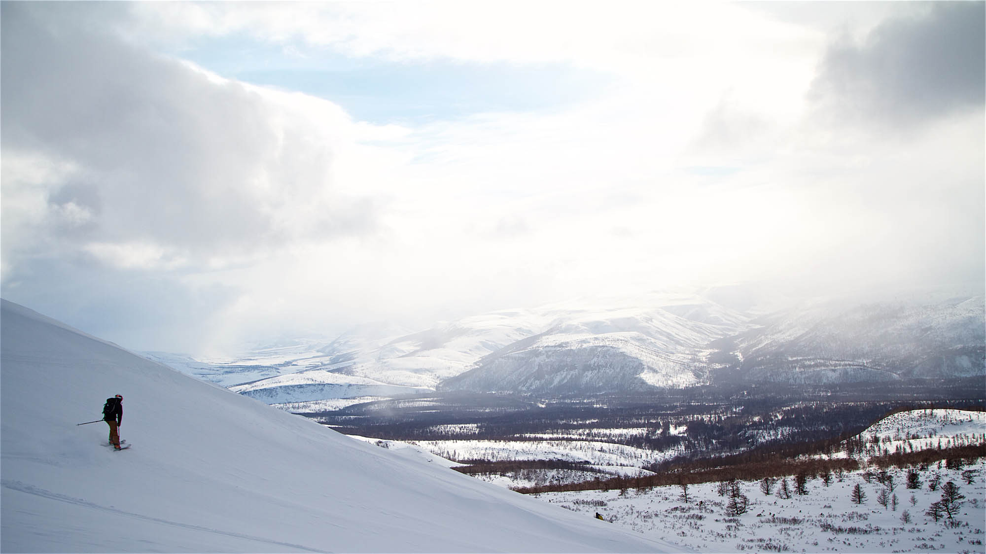 With bad weather blocking our access to Klyuchevskaya Sopka, we went skiing outside Esso instead. Ivan towed us into the backcountry, and we got our fill with 150-meter, mini-golf style lines etched between rock bands. Lunch was in a hut that Ivan and some locals had built the previous summer, and after a full day of skiing, we drank deep from tall, cold Tuborg beers in the soothing warm waters of the Esso hot springs. When the weather cleared, we left Esso for Klyuchi, the town that would serve as our launchpad for the Klyuchevskaya Sopka volcano.