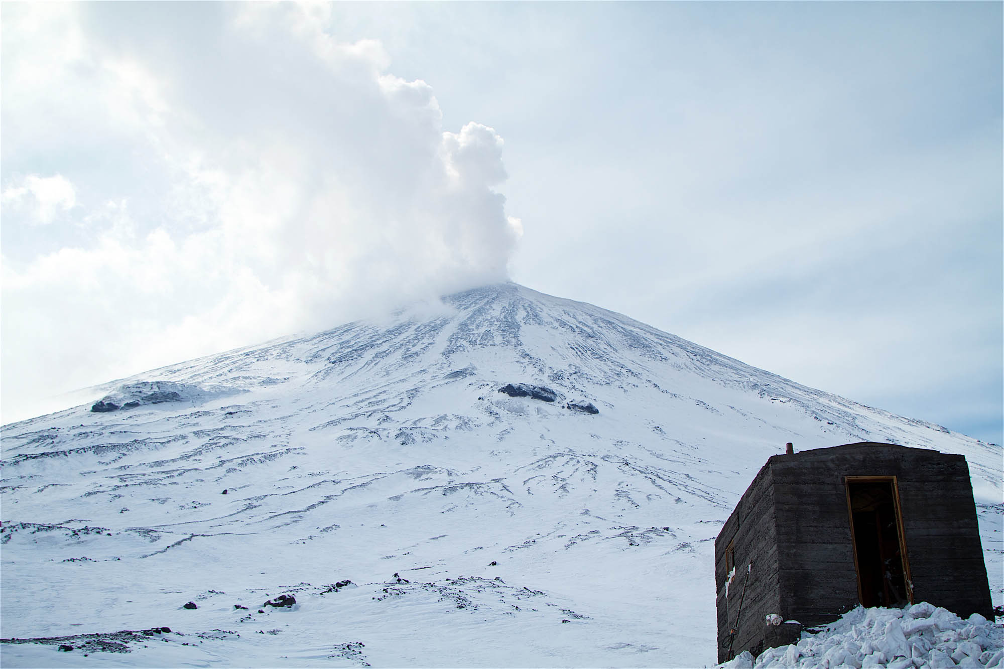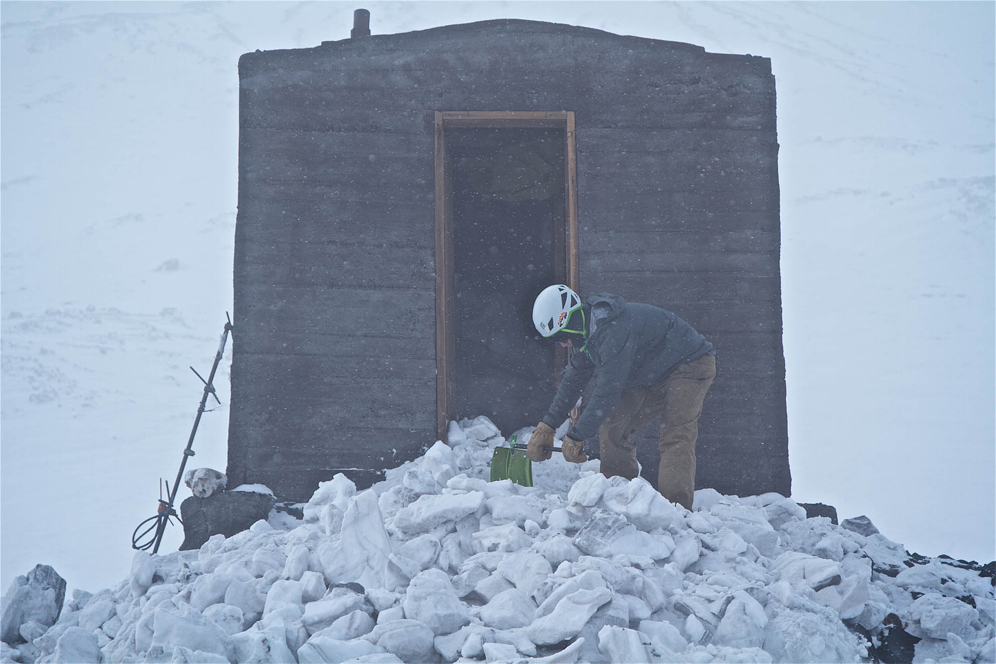 "In this world, there are two types of people. Those with loaded guns, and those who dig. You dig.” Herder excavates the volcanologist hut. Upon our arrival, we found it filled with snow from floor to ceiling, and were unable to even open the door. Photo: Fojtik