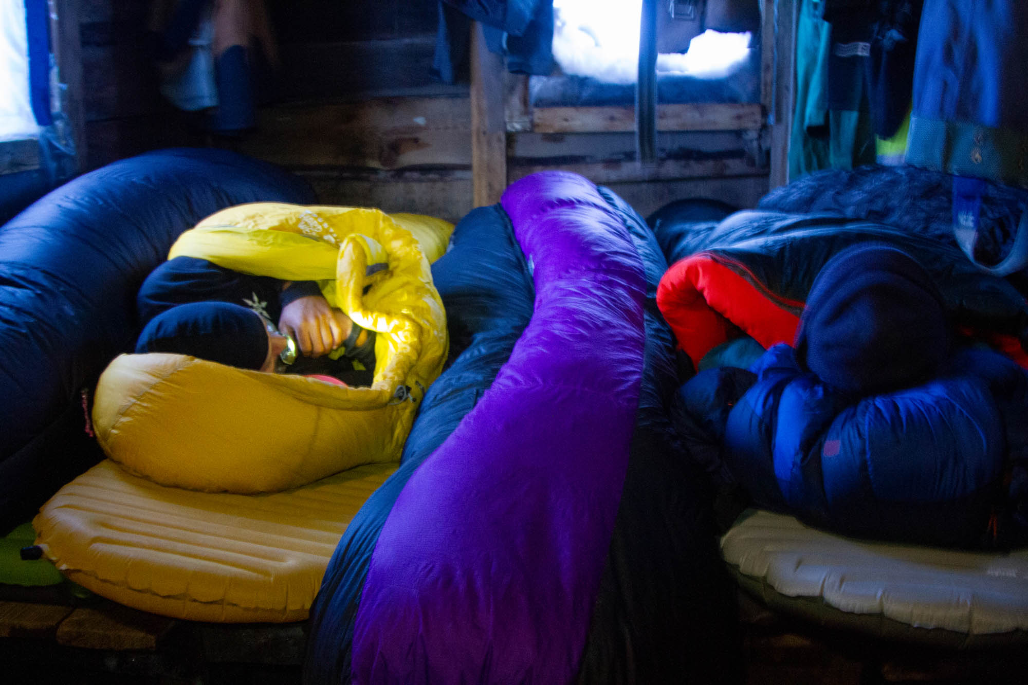 The research hut, if you can call it that, was a derelict cement bunker filled floor-to-ceiling with snow. Tom had to slither in through a broken window to start the excavation process. Once dug out, the seven of us barely fit inside, and had to sleep staggered head-to-toe. On the first night, even jammed together in our -20 and -40 degree sleeping bags, the cold bit at our noses and toes.