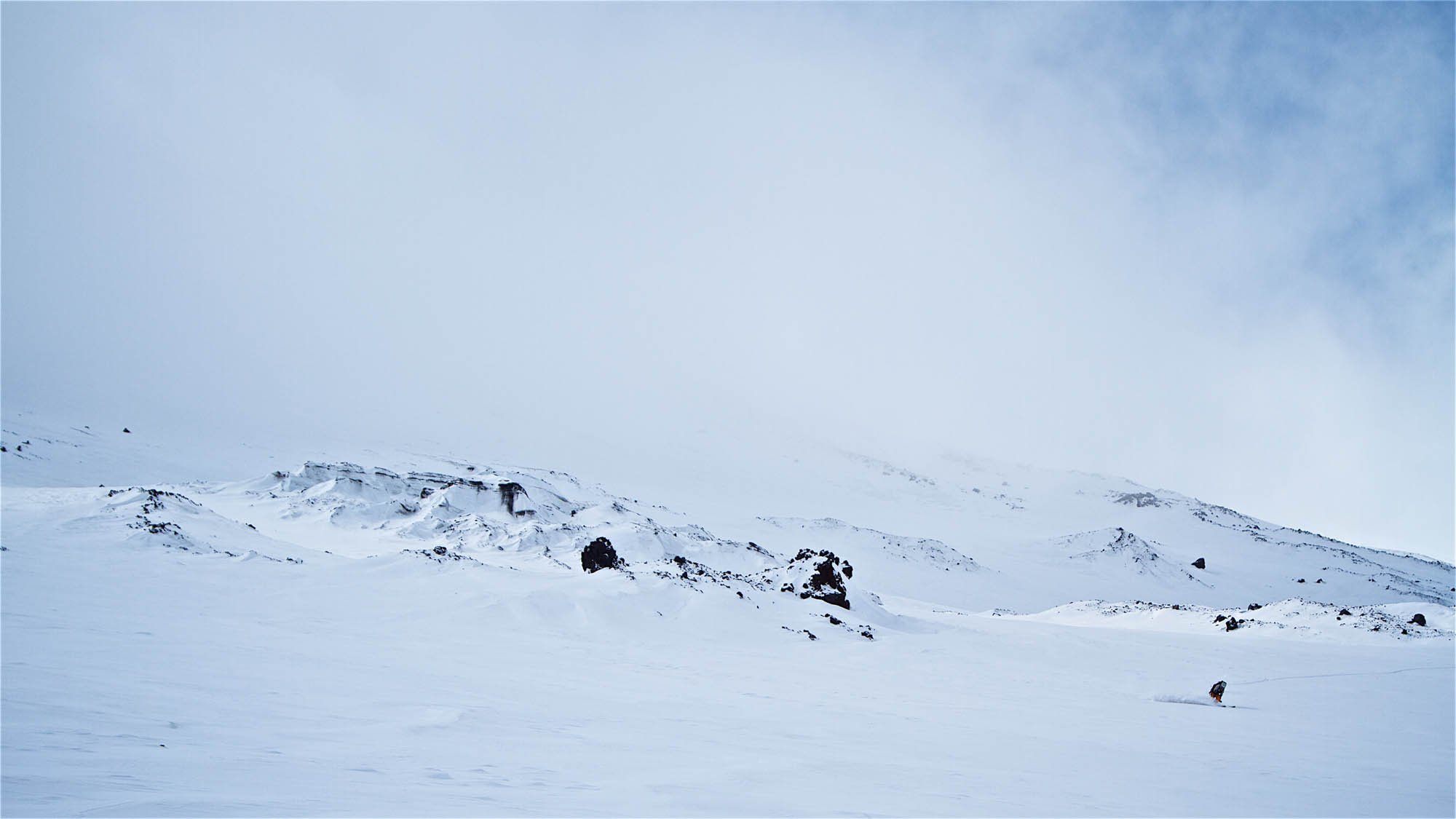 There’s a volcano up there somewhere. Andrey carves a few turns on the lava fields below Klyuchevskaya Sopka as the mountain gets engulfed in clouds.