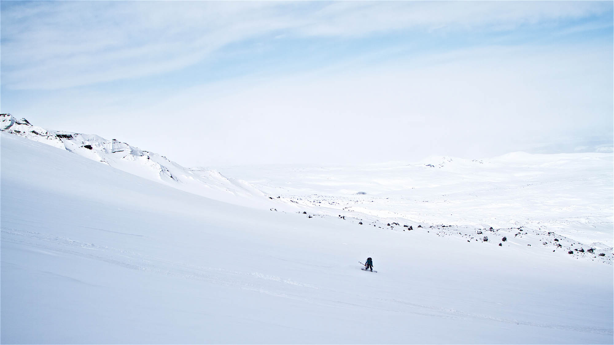 As far as the eye can see: Luke rides back to the hut after a recon mission to find a way through the glaciers on Klyuchenskaya Sopka. The lava fields surrounding the volcano extend some 40 kilometers in every direction.