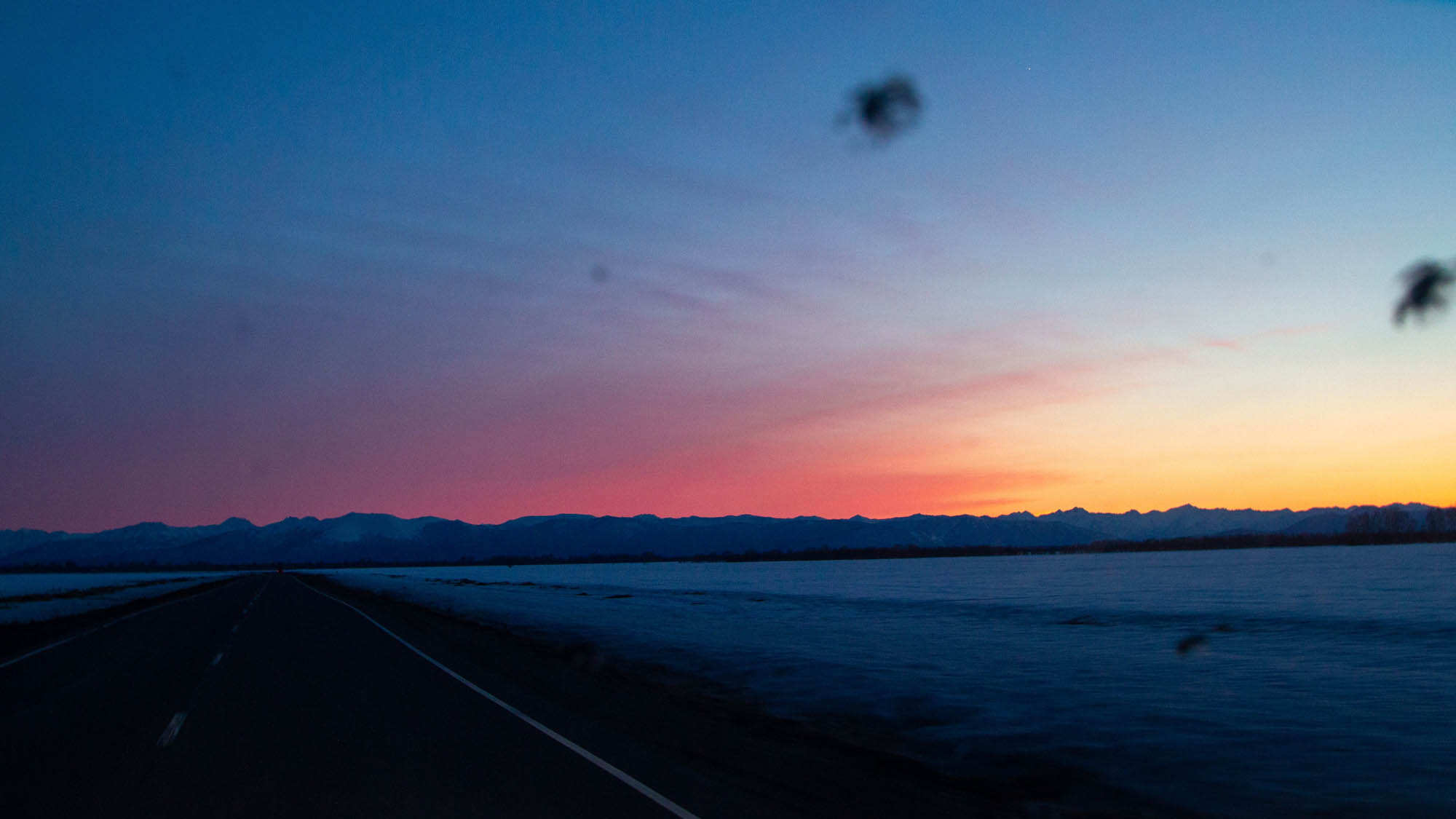 Sunset over Kamchatka. After pulling us out of Klyuchevskaya Sopka, Ivan drove us through the night to Petropavlosk.