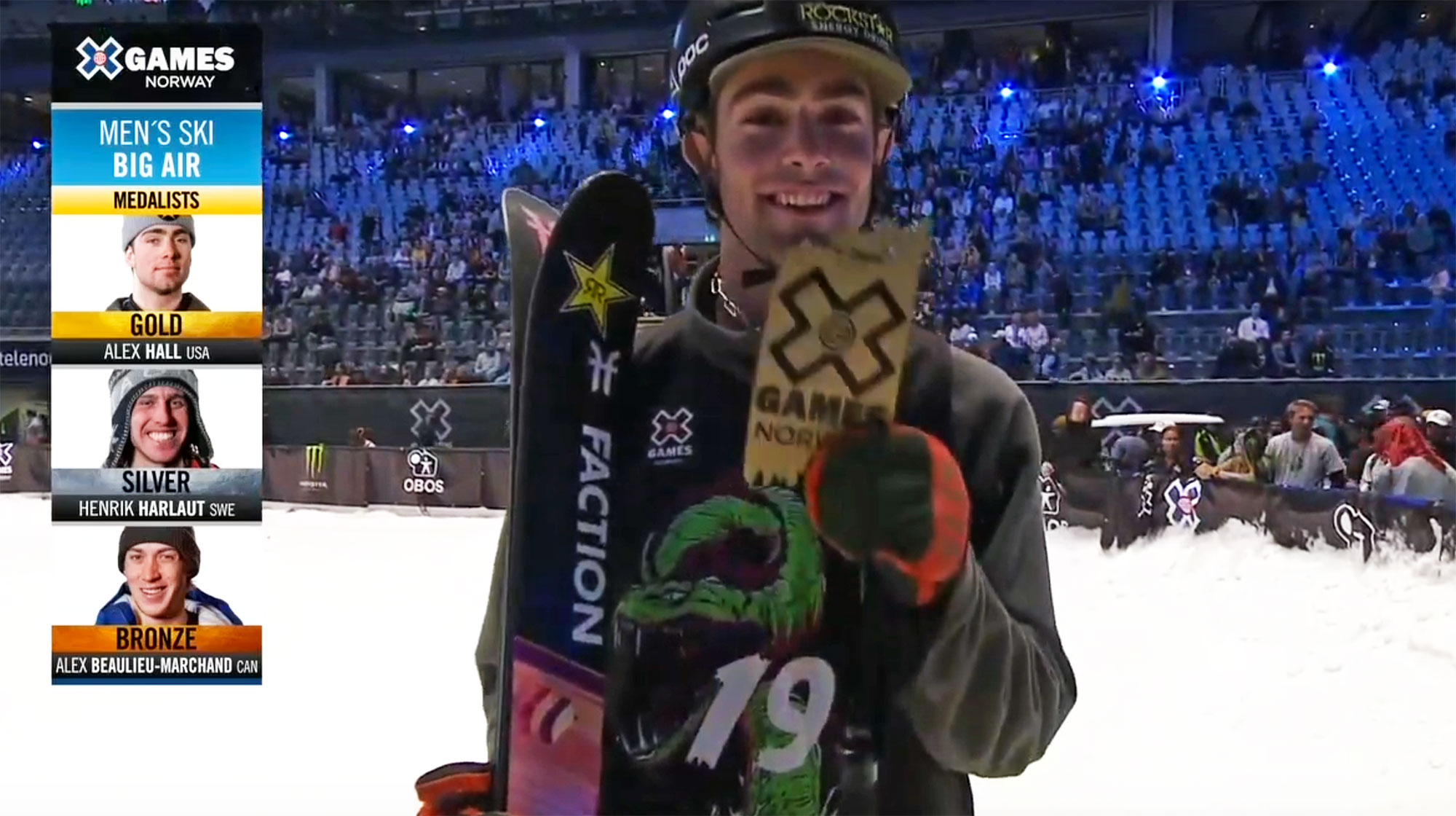 Events Report Alex Beaulieu-MarchandAlex HallHenrik HarlautX Games Indoor big air Alex Hall Claims Gold at X Games Norway 2019 Big Air An X Games Big Air at the end of August, through the roof of a stadium in Oslo? Why not? By: Ethan Stone August 31, 2019