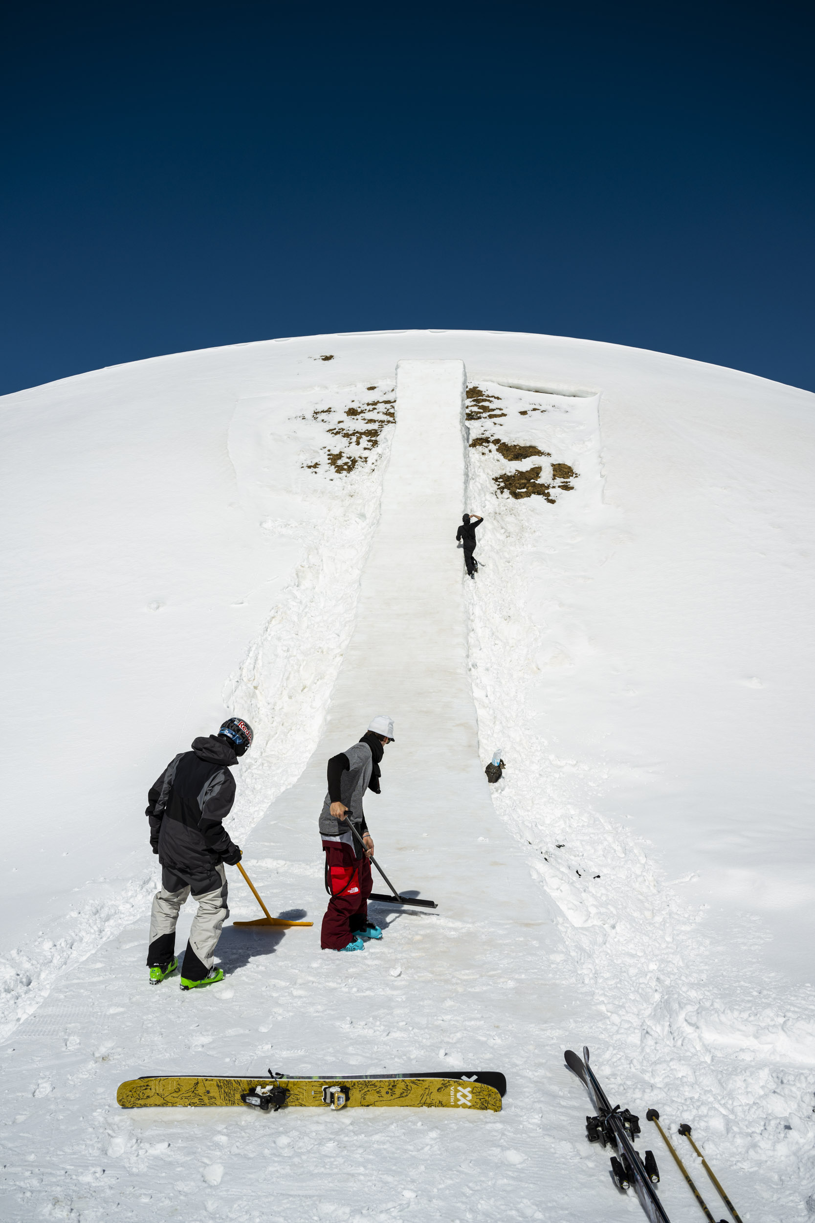 The secret location holds the natural terrain for the perfect jump setting. The spot, discovered by local freeskier Tom Ritsch, is so remote, no machinery can be on site at the 2400m high alpine location. Instead,  there’s a dedicated shape crew to hand build this unique jump.